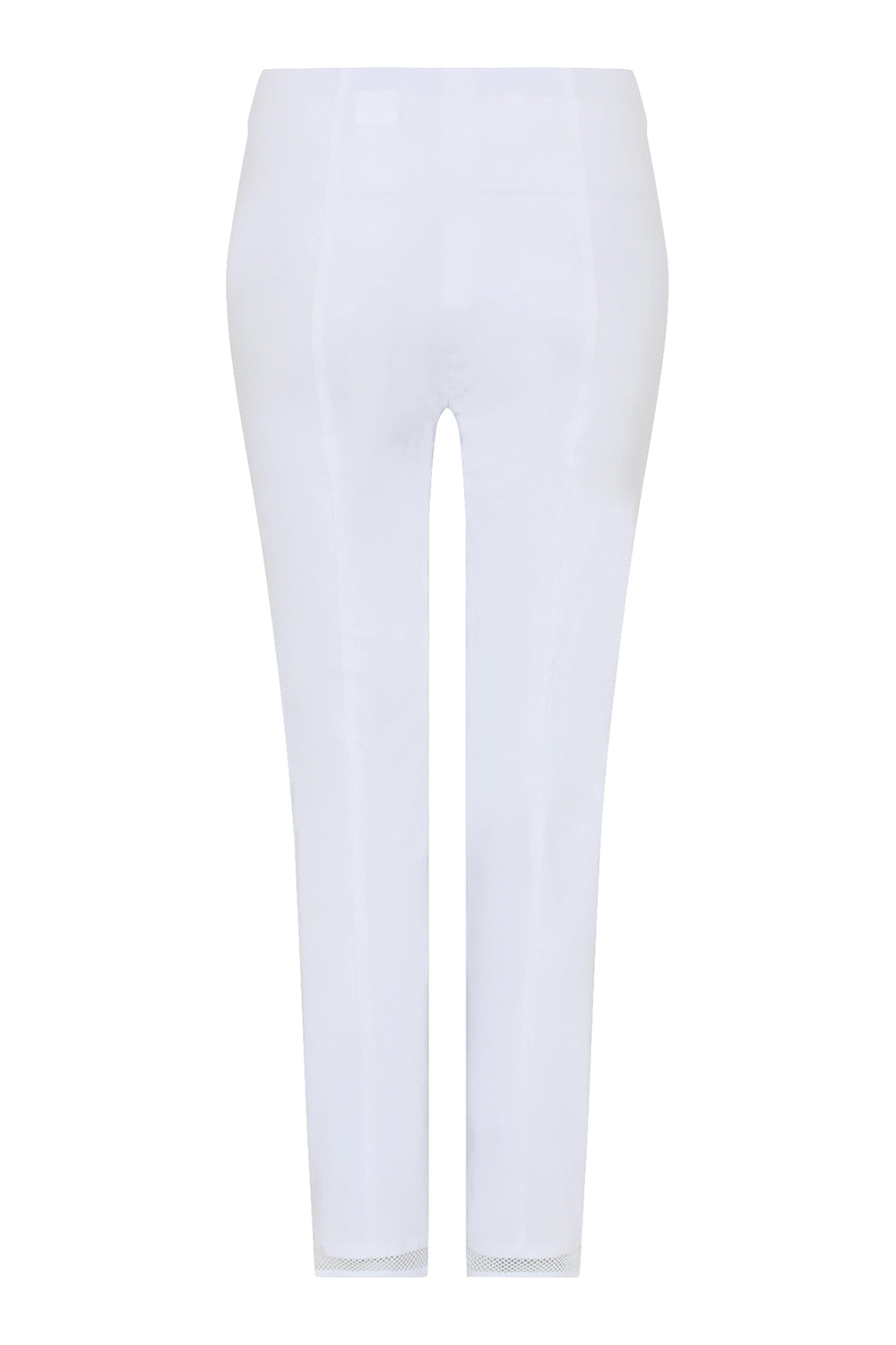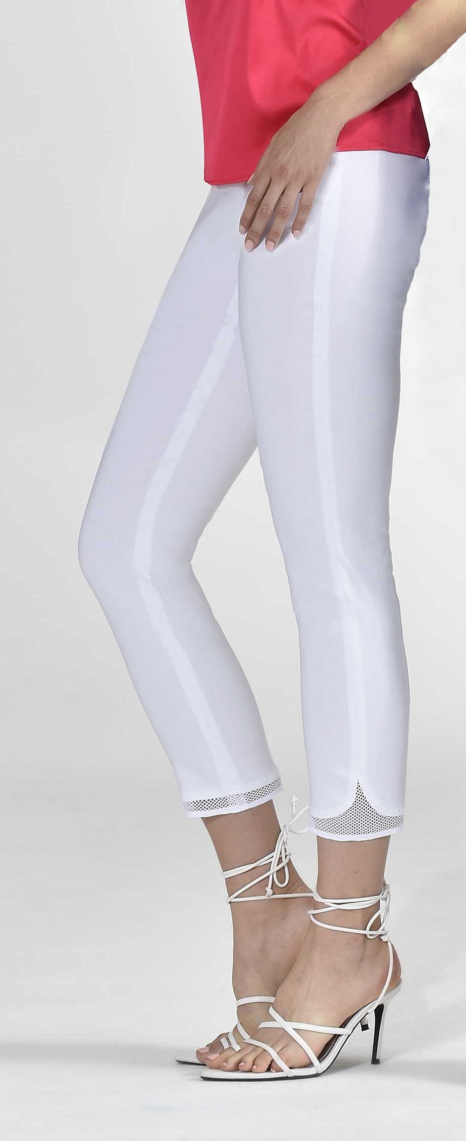 This Rose 09 white pant has a tulip cut hem with a mesh insert. Fun and flirty! Available in white only. Slim Fit Pant 27" Inseam