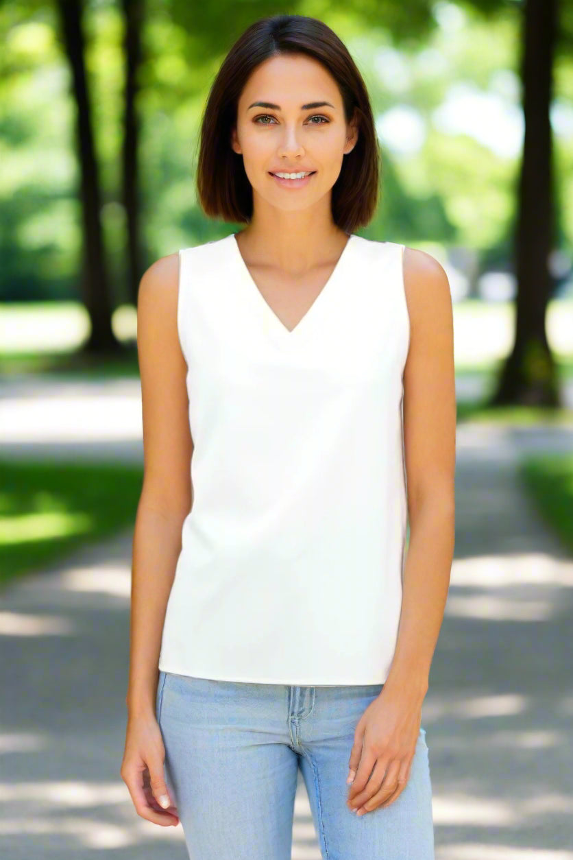 Sleeveless V-Neck Styling. This beautiful top can be worn alone or under the Stretch Crepe Blouse/Jacket. For a complete look, pair with the Estelle & Finn Stretch Crepe Pant.