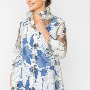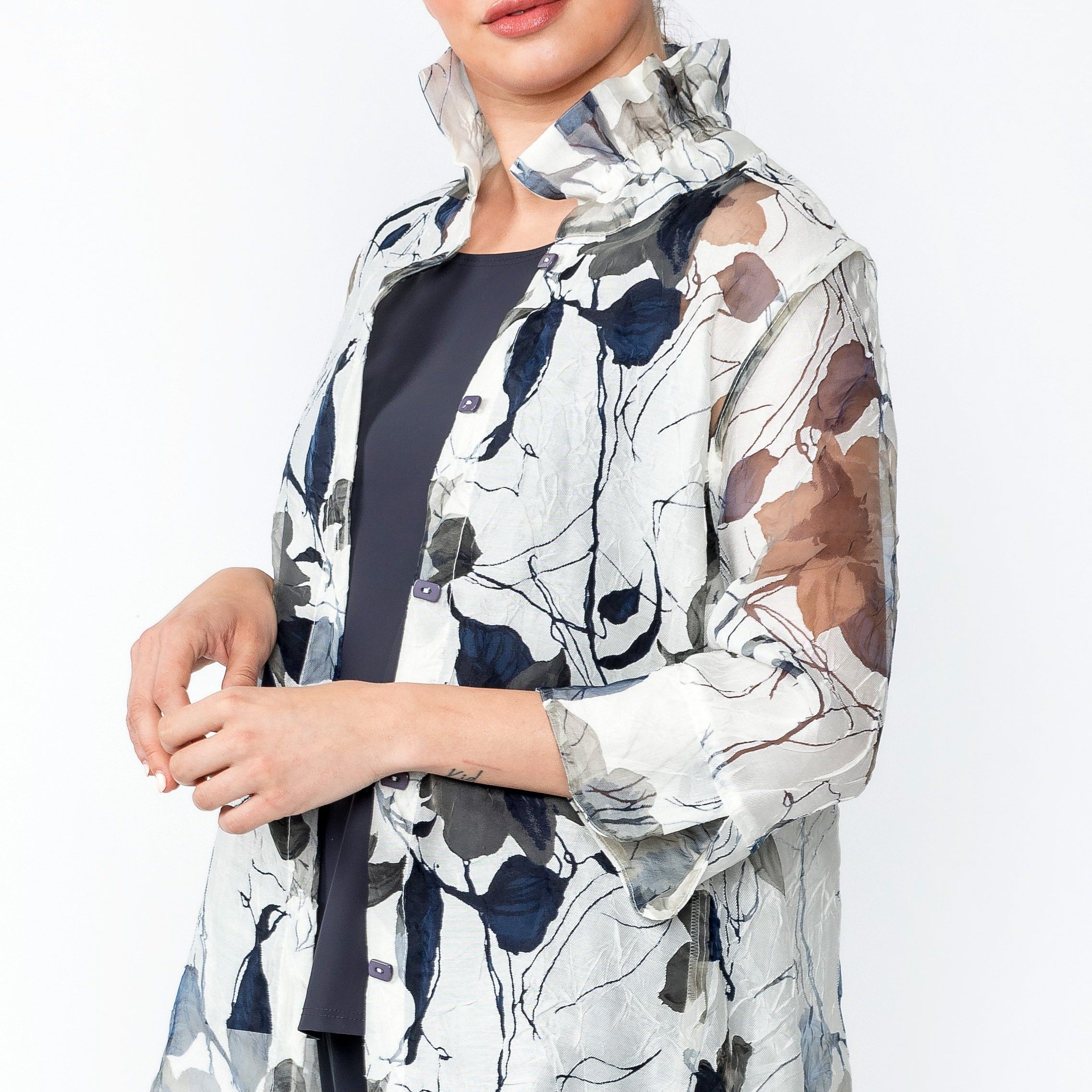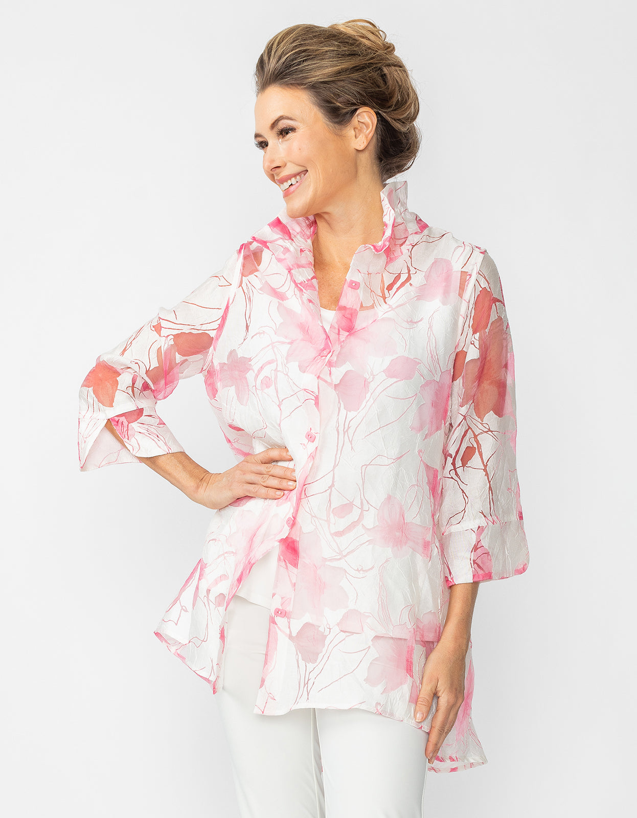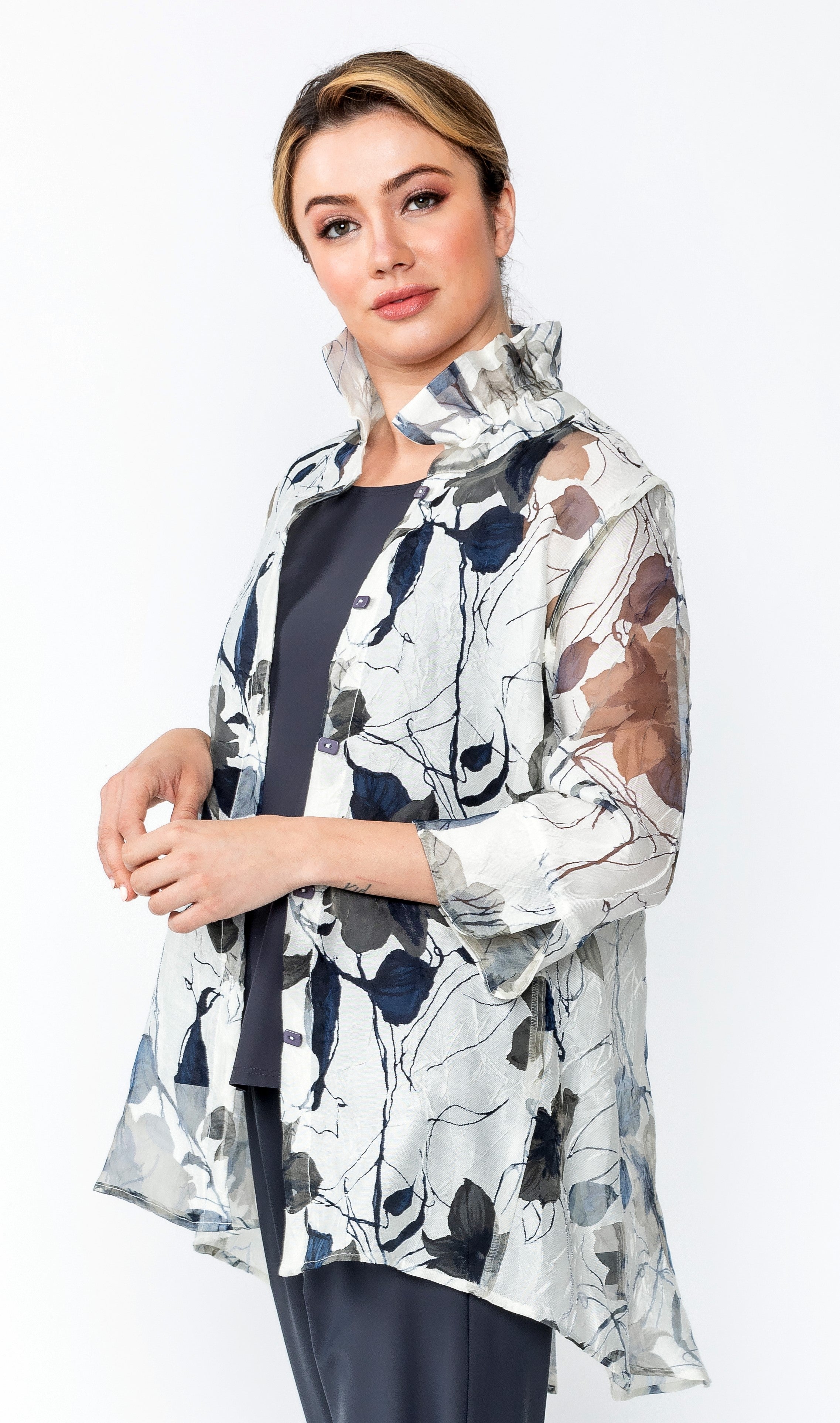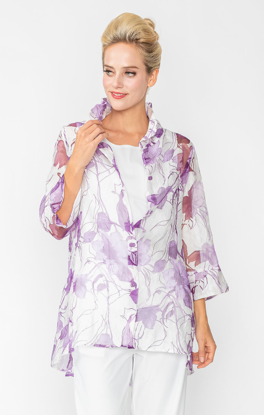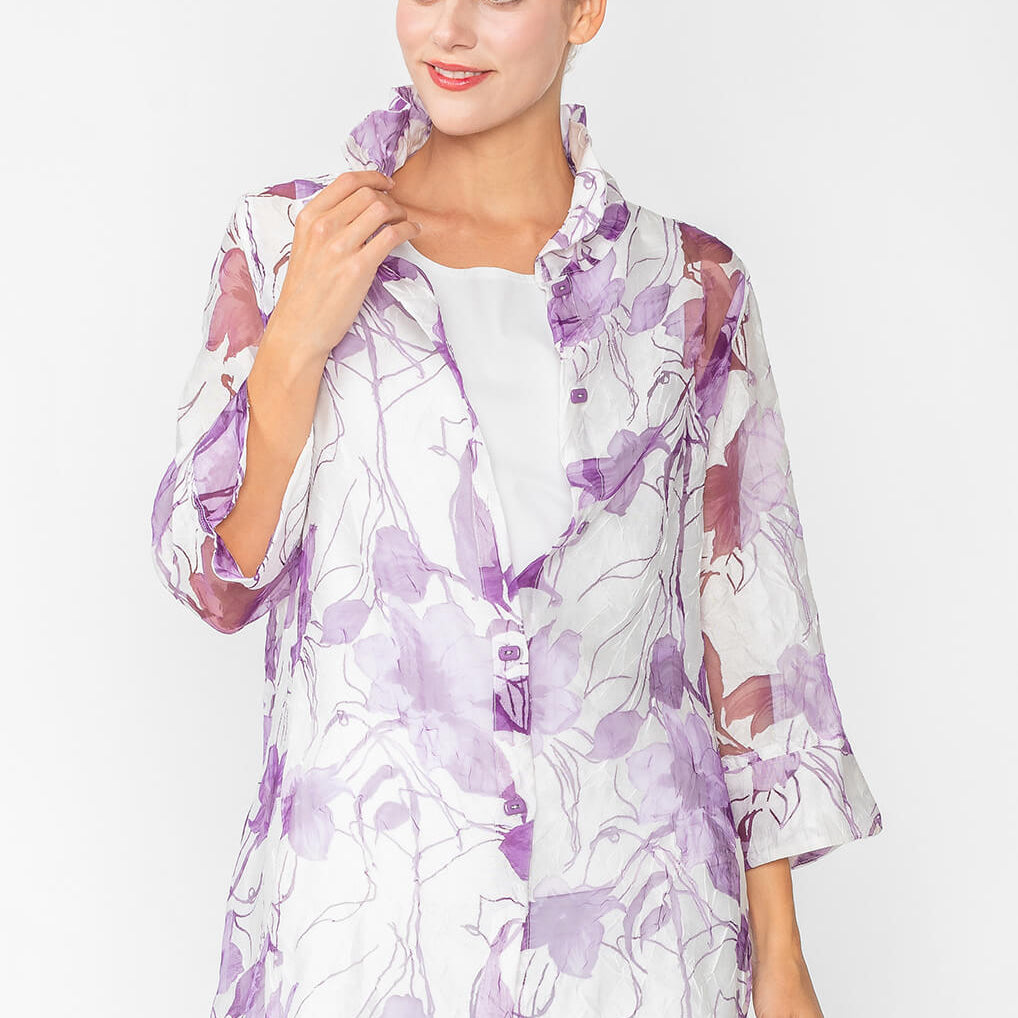 Button Front Purple Floral Burnout Jacket with Ruched Collar