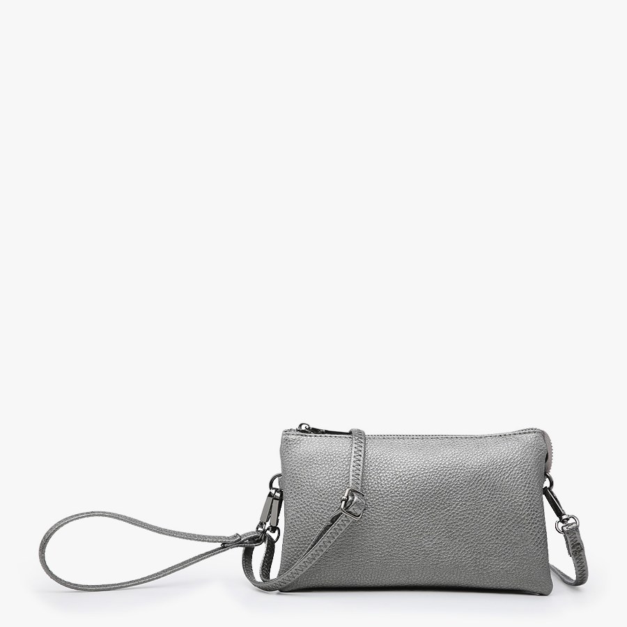 The perfect compact bag, you can carry this bag three ways; crossbody, shoulder or wristlet, made with a vegan leather, it has a zipper closure and comes in many assorted colors.