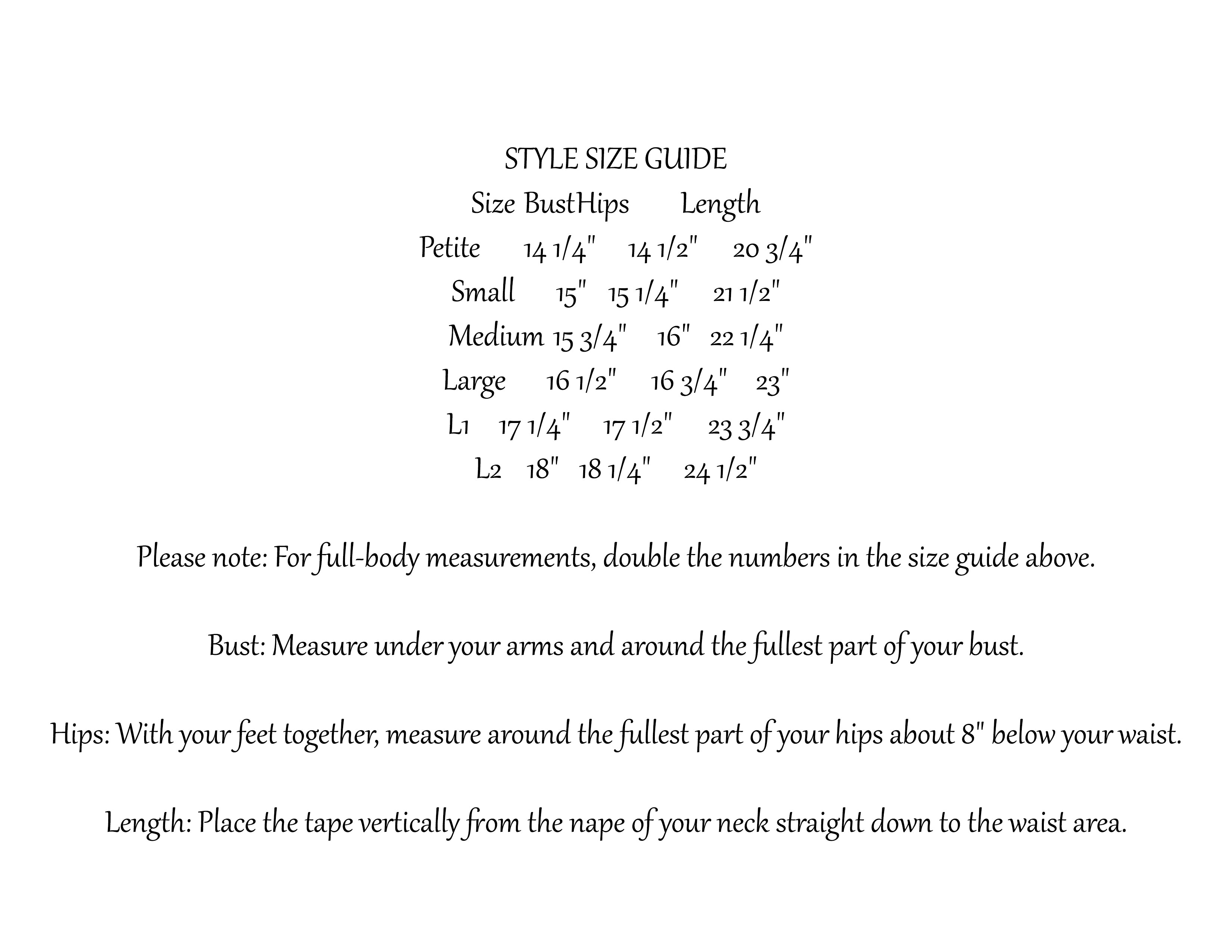 Sizes Petite to L2. Items from this Collection, if not in stock can possibly be ordered. These special orders are non-refundable. No Cancellations. For questions regarding special orders or additional colors please call 239-434-1885.