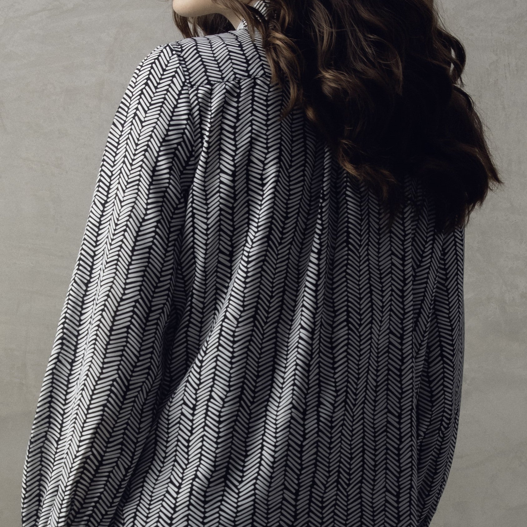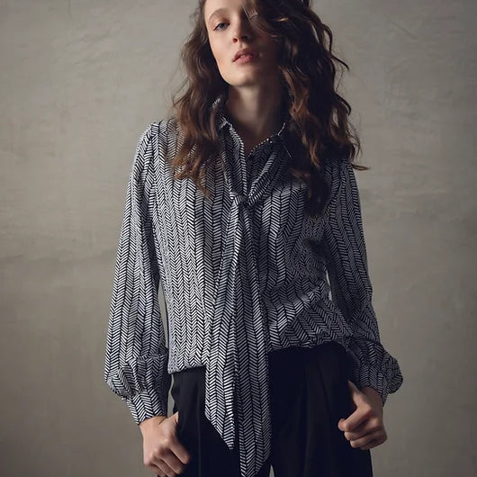 Marble Button Front Herringbone LS Blouse w Tie