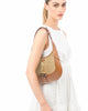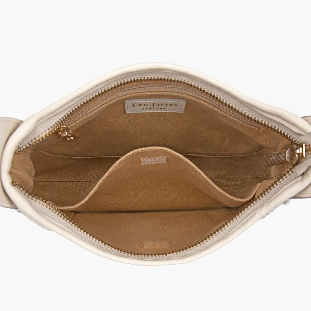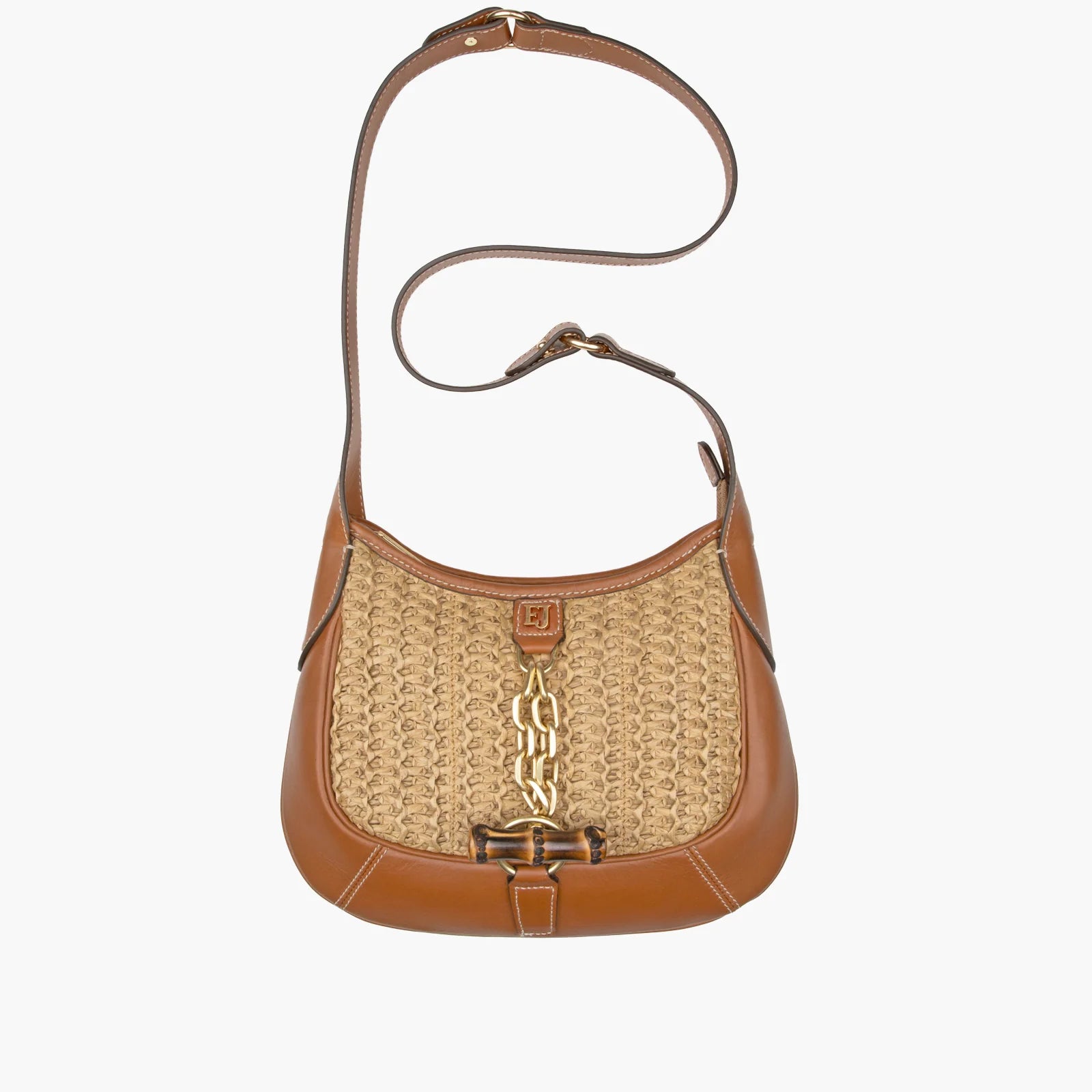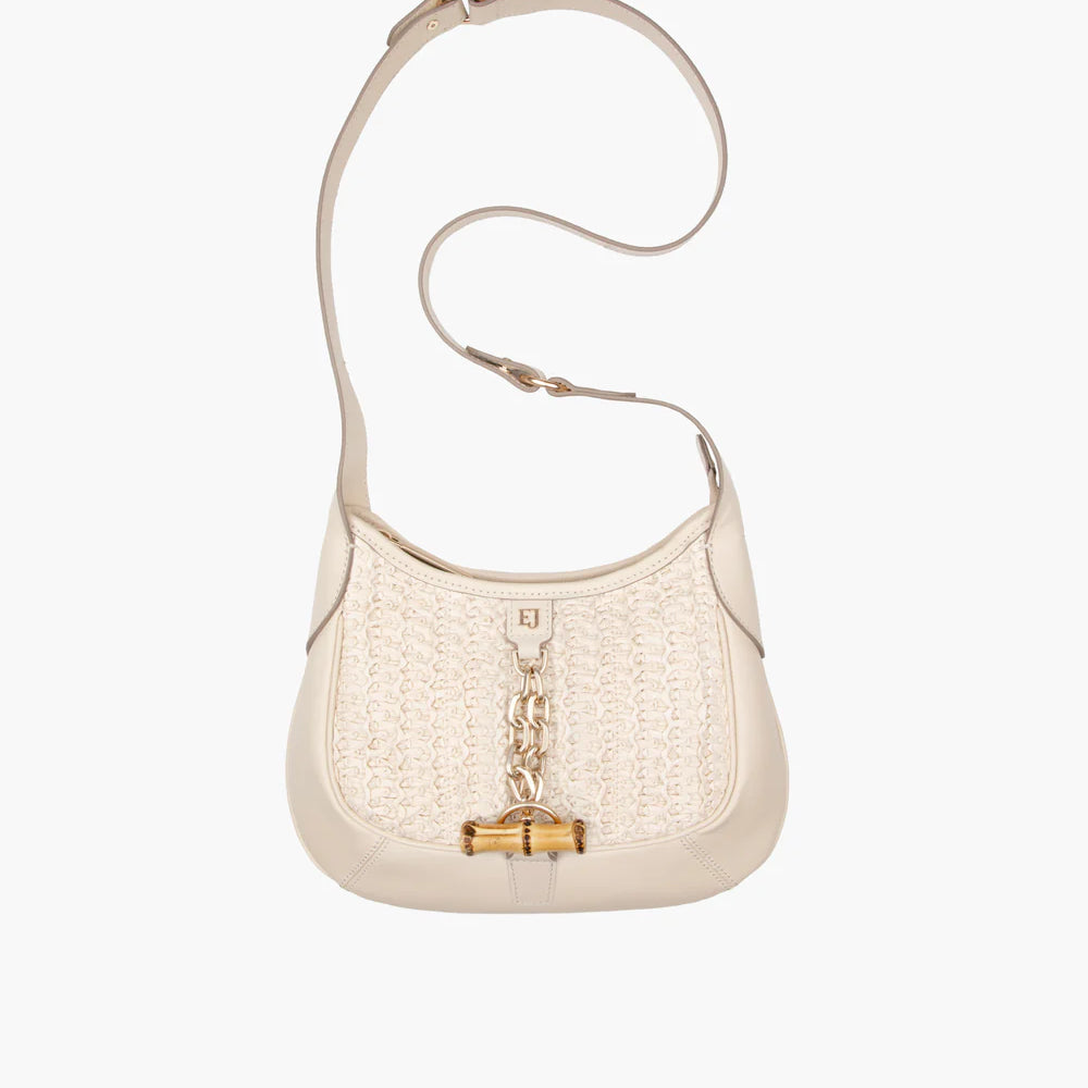 Body construction is soft with crochet raffia straw center panels framed with buttery soft napa leather. The leather handle extension gives the option to wear Lil Isle at shoulder or crossbody length.
