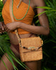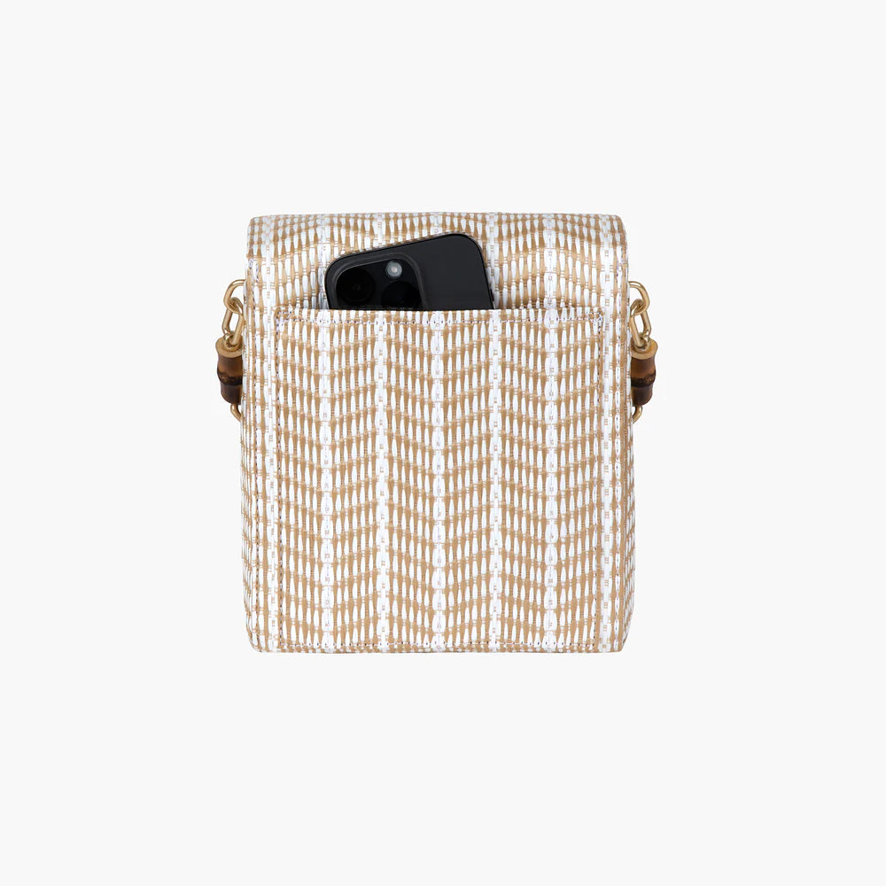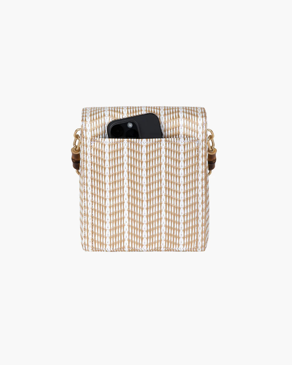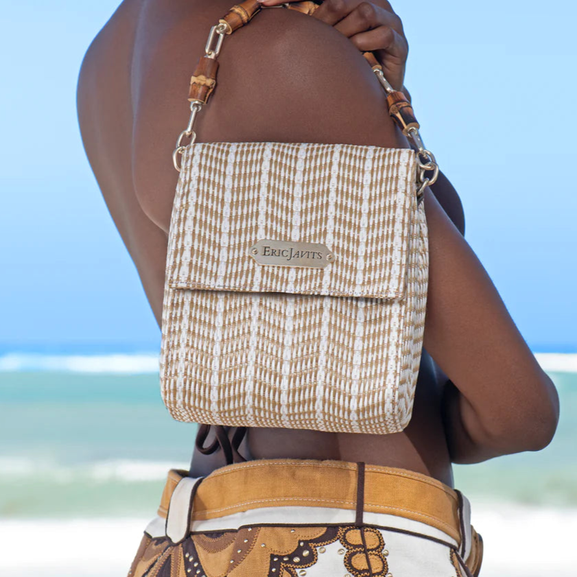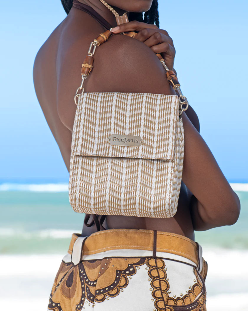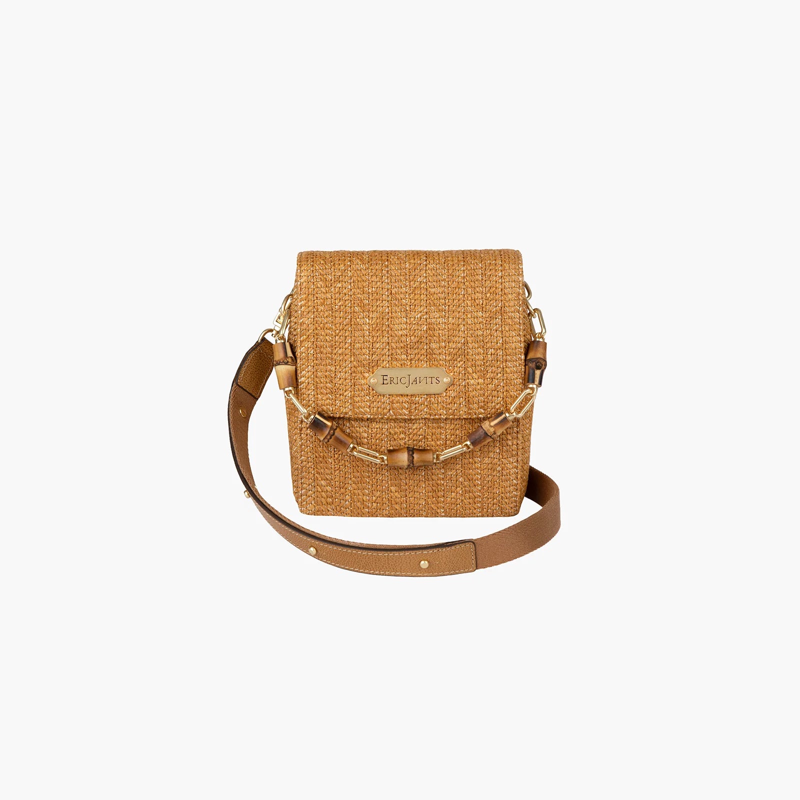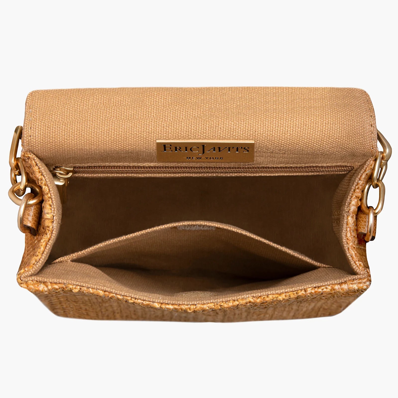 A small raffia straw flap pouch inspired by the casual chic lifestyle of the Italian Riviera. The bamboo chain top handle dangles as ornamentation when using the long adjustable crossbody strap of cotton twill and leather.