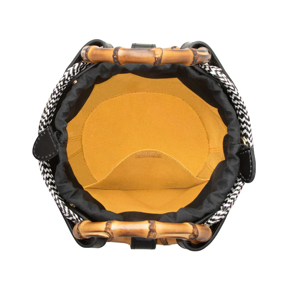 The small bucket shape body made of Squishee® straw features leather trim, dual bamboo ring short handles, a drawstring pouch top closure and a detachable leather strap which adjusts from shoulder to cross-body length with a buckle. Other features include, protective bottom feet, and water-repellent canvas lining with an interior patch pocket.