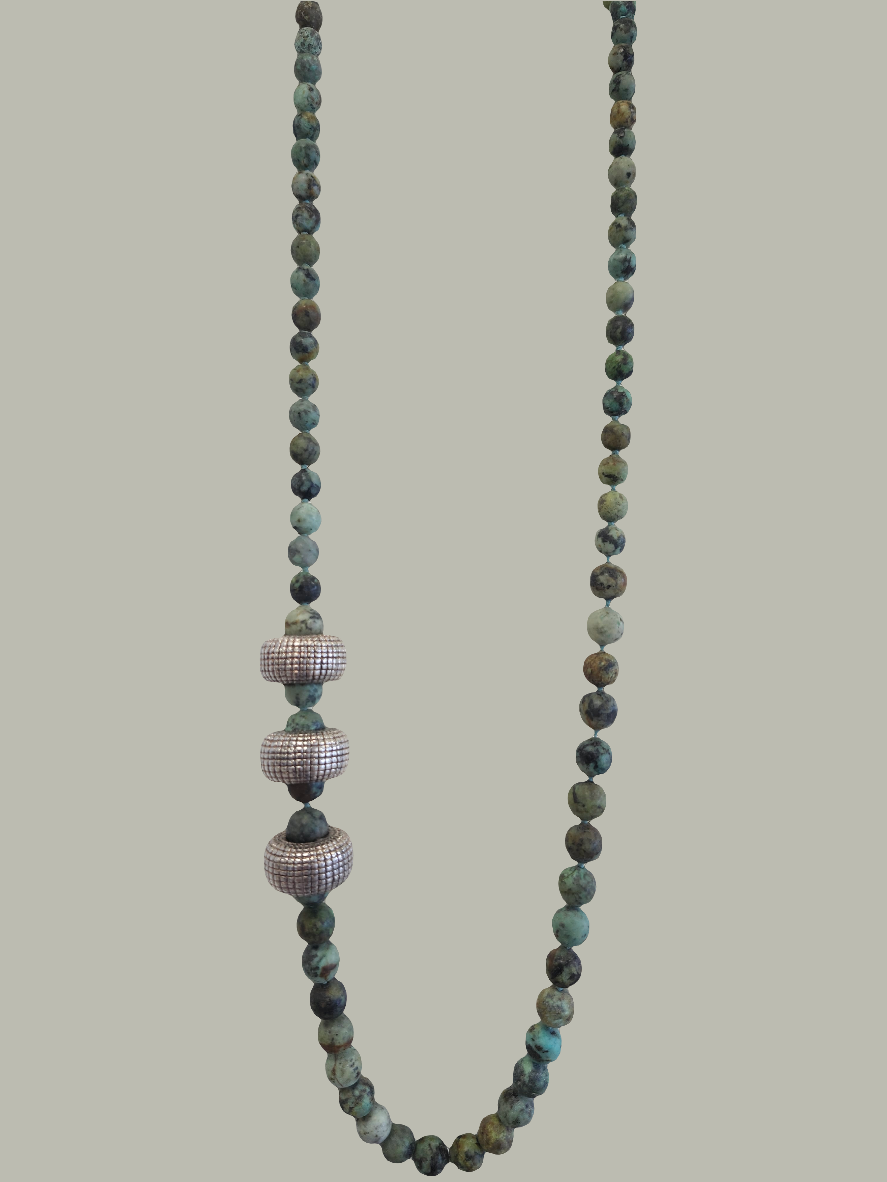 MOSS AGATE AND JADE W 3 SILVER BEADS
