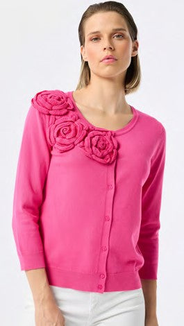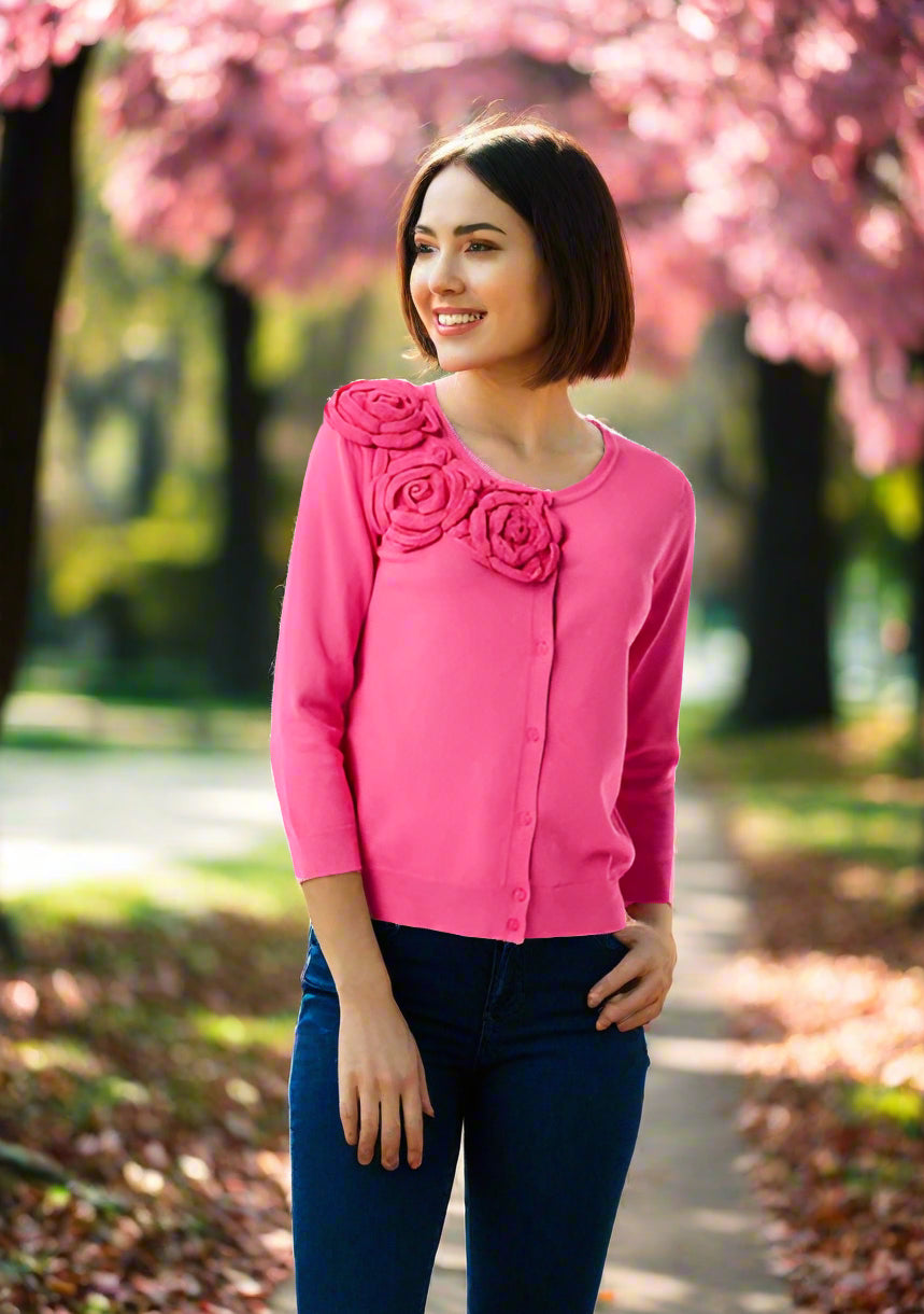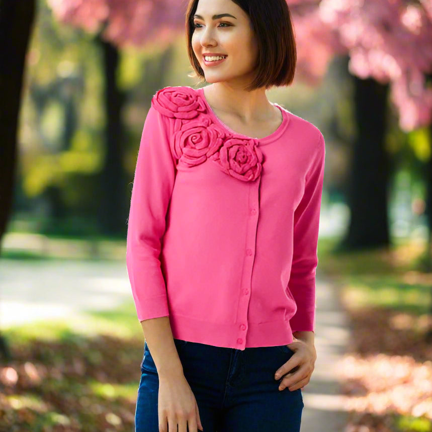 3/4 Sleeve Cardy with 3D Rose Detail on Shoulder