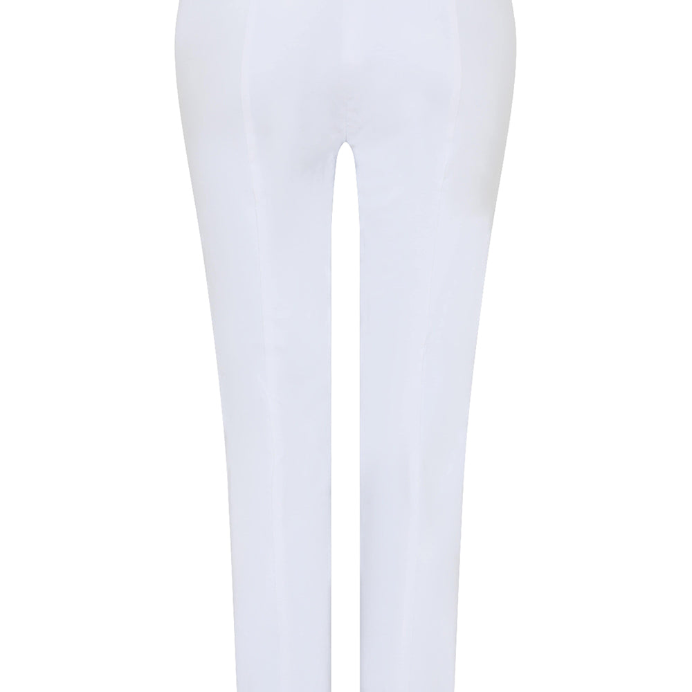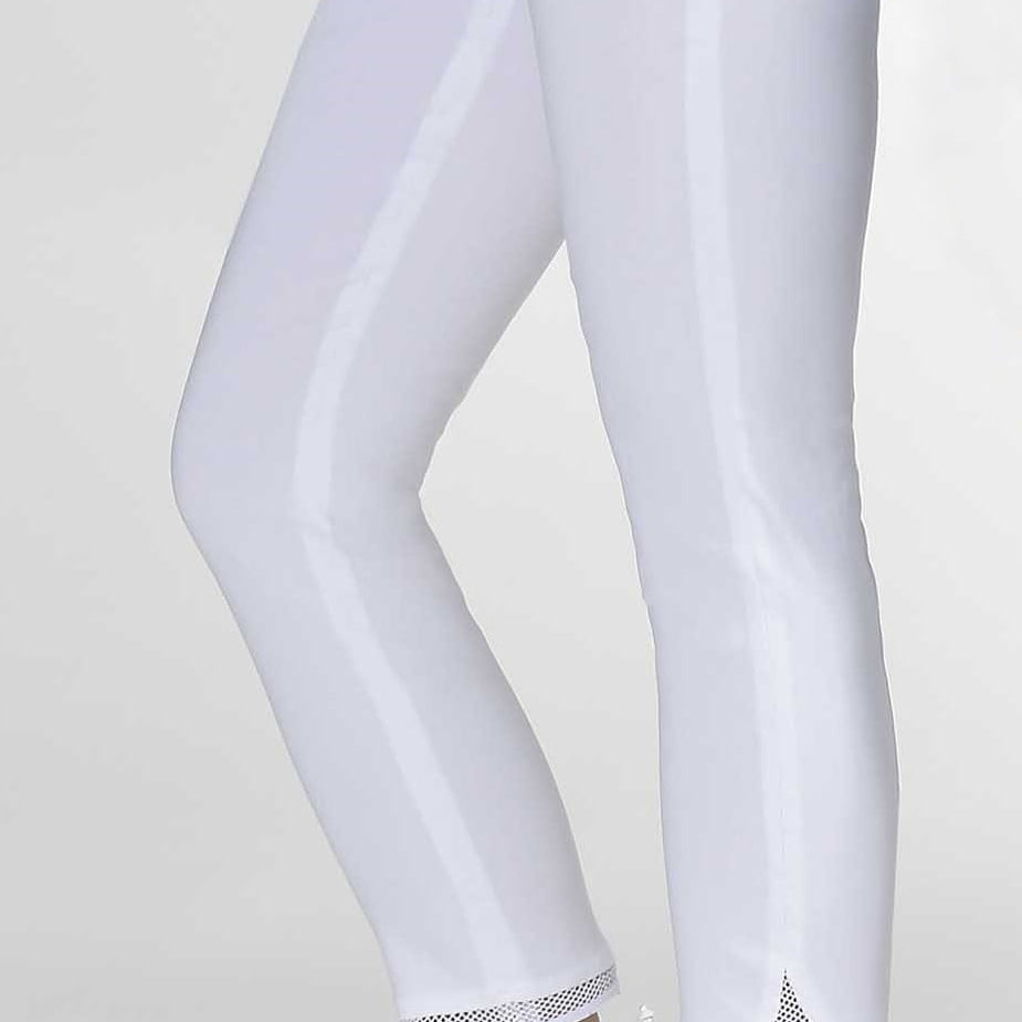 This Rose 09 white pant has a tulip cut hem with a mesh insert. Fun and flirty! Available in white only. Slim Fit Pant 27" Inseam