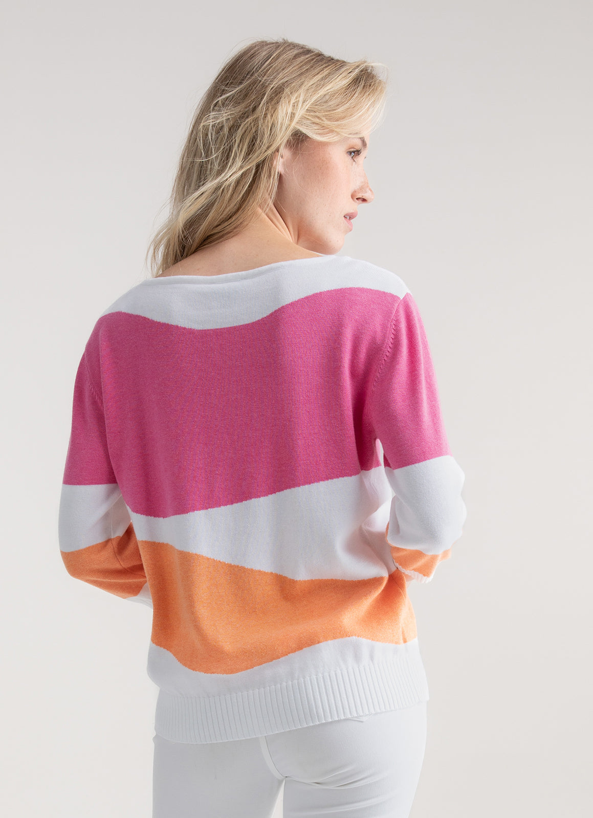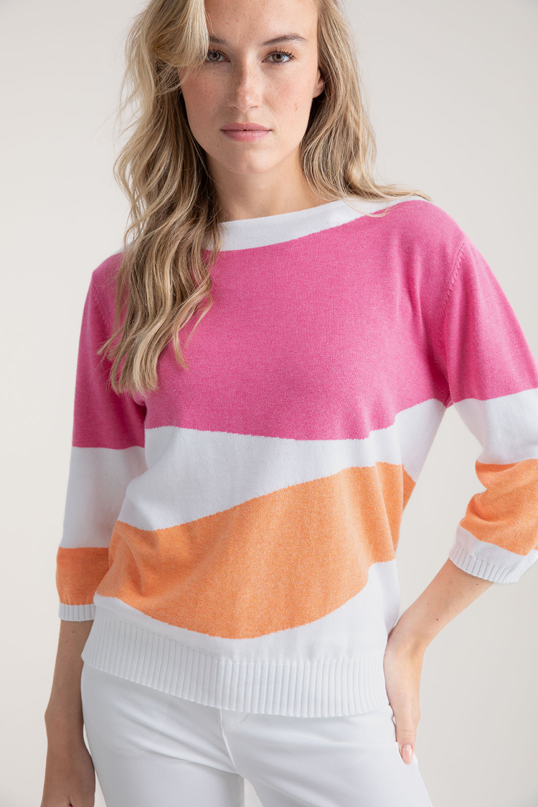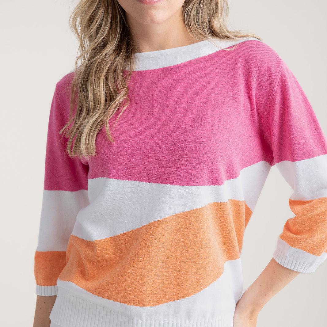 Relaxed Fit Boatneck 3/4 Sleeve Abstract Wave Print Sweater in 100% Cotton