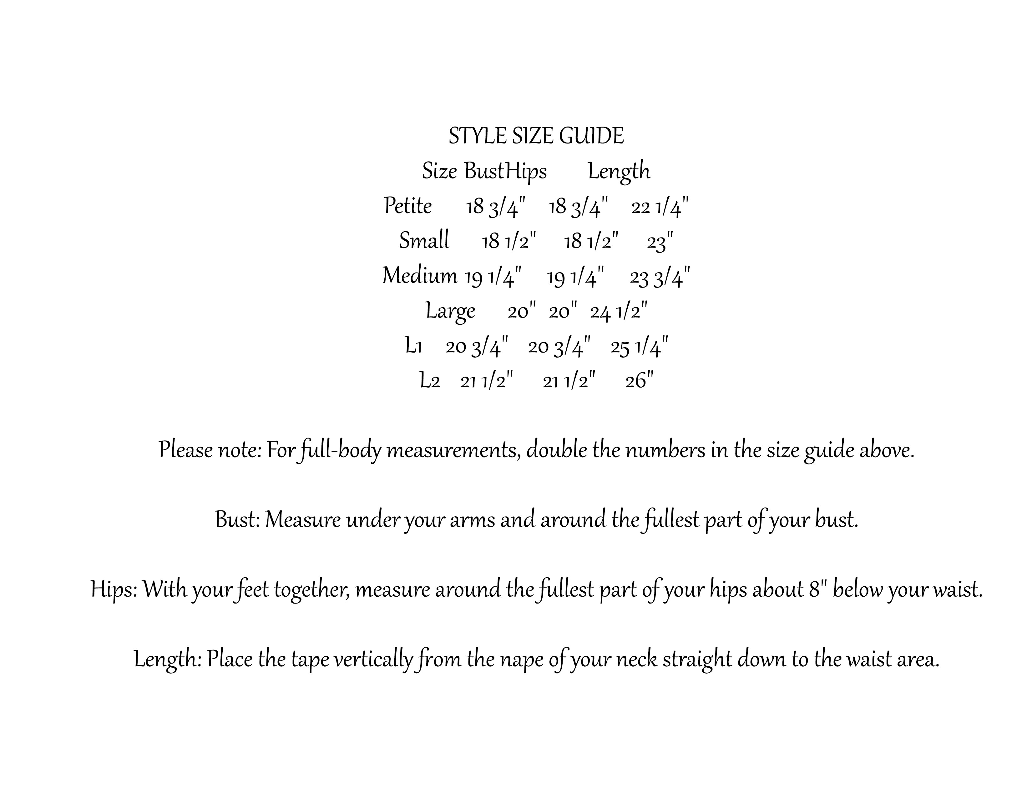 Sizes Petite to L2. Items from this Collection, if not in stock can possibly be ordered. These special orders are non-refundable. No Cancellations. For questions regarding special orders or additional colors please call 239-434-1885.
