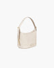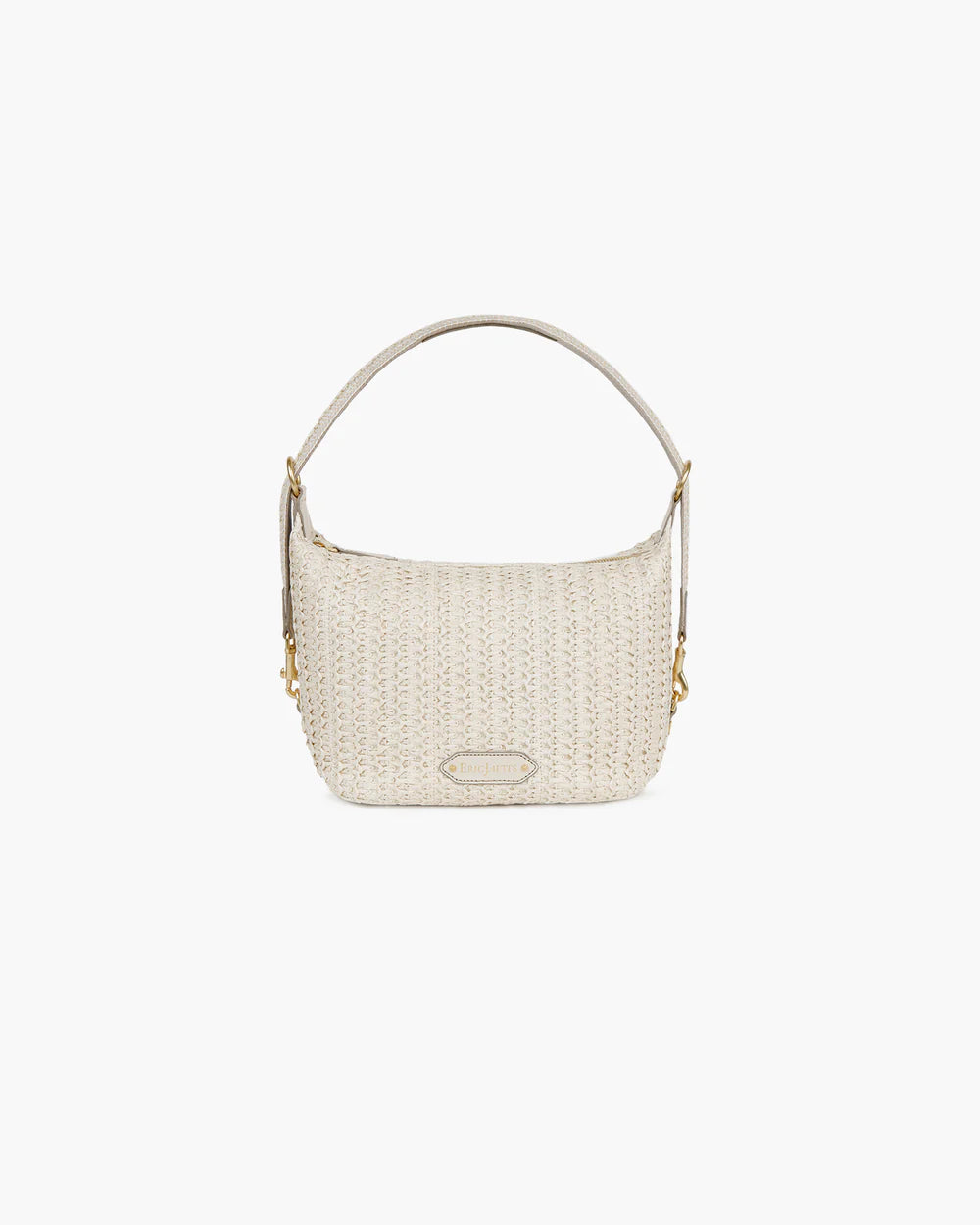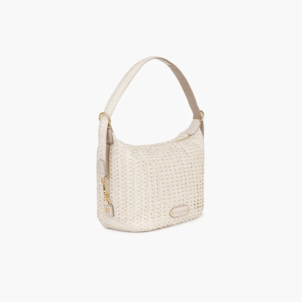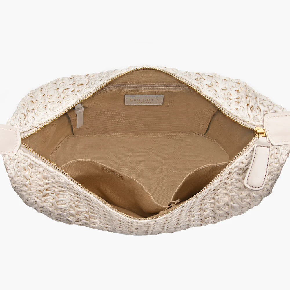 Mid-size Hobo of woven raffia straw with calf leather trim has a zip-top closure and an easy strap that adjusts to three separate lengths.