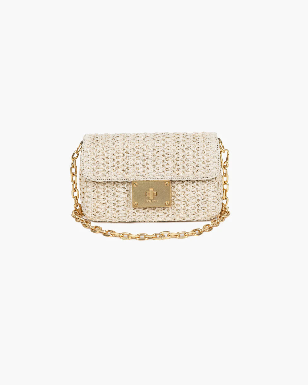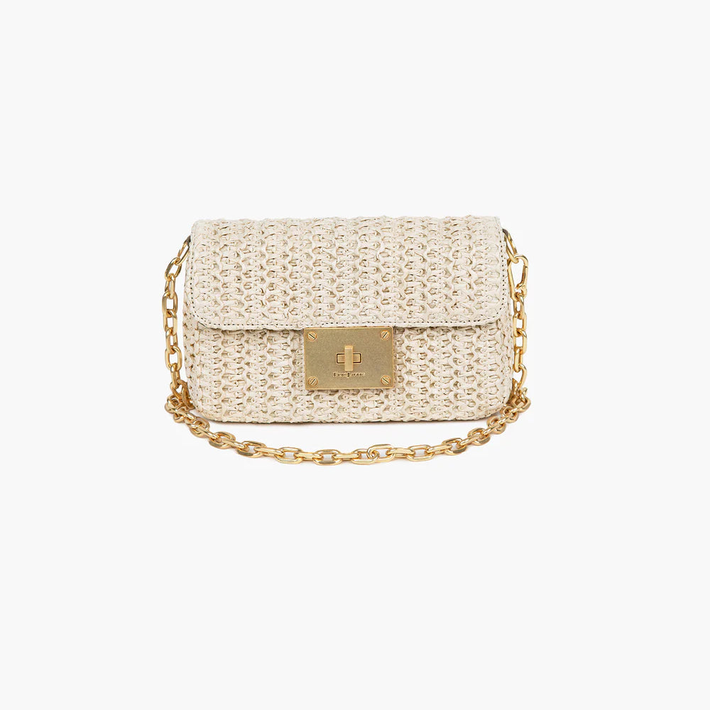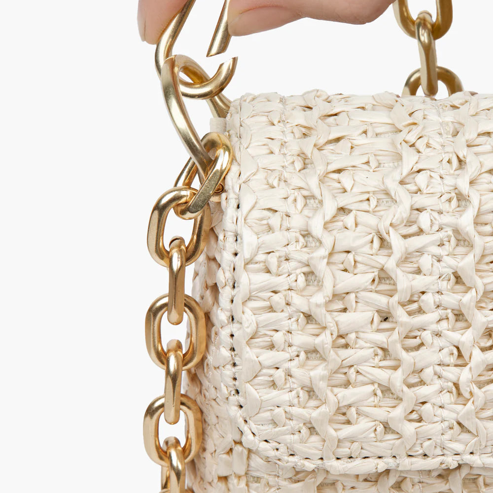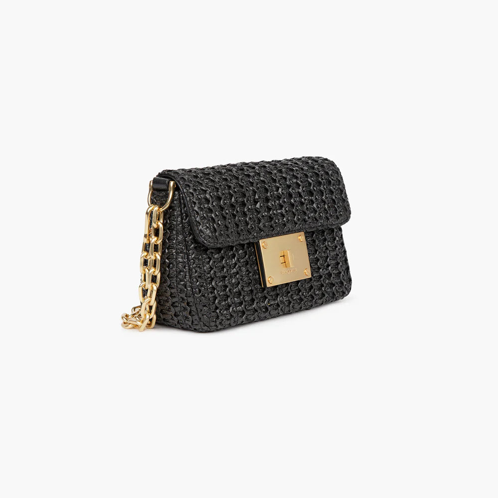 Parisian inspired pouch bag in woven raffia crochet features a bold turn lock closure, chain link shoulder strap that adjusts to longer length for crossbody use, and an outer rear pocket for easy access to phone.