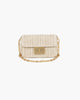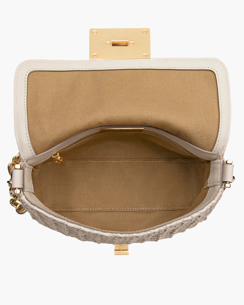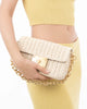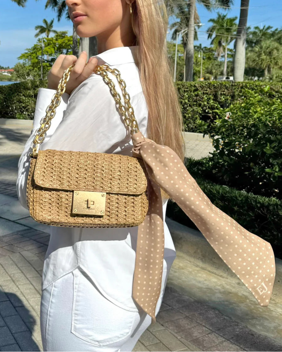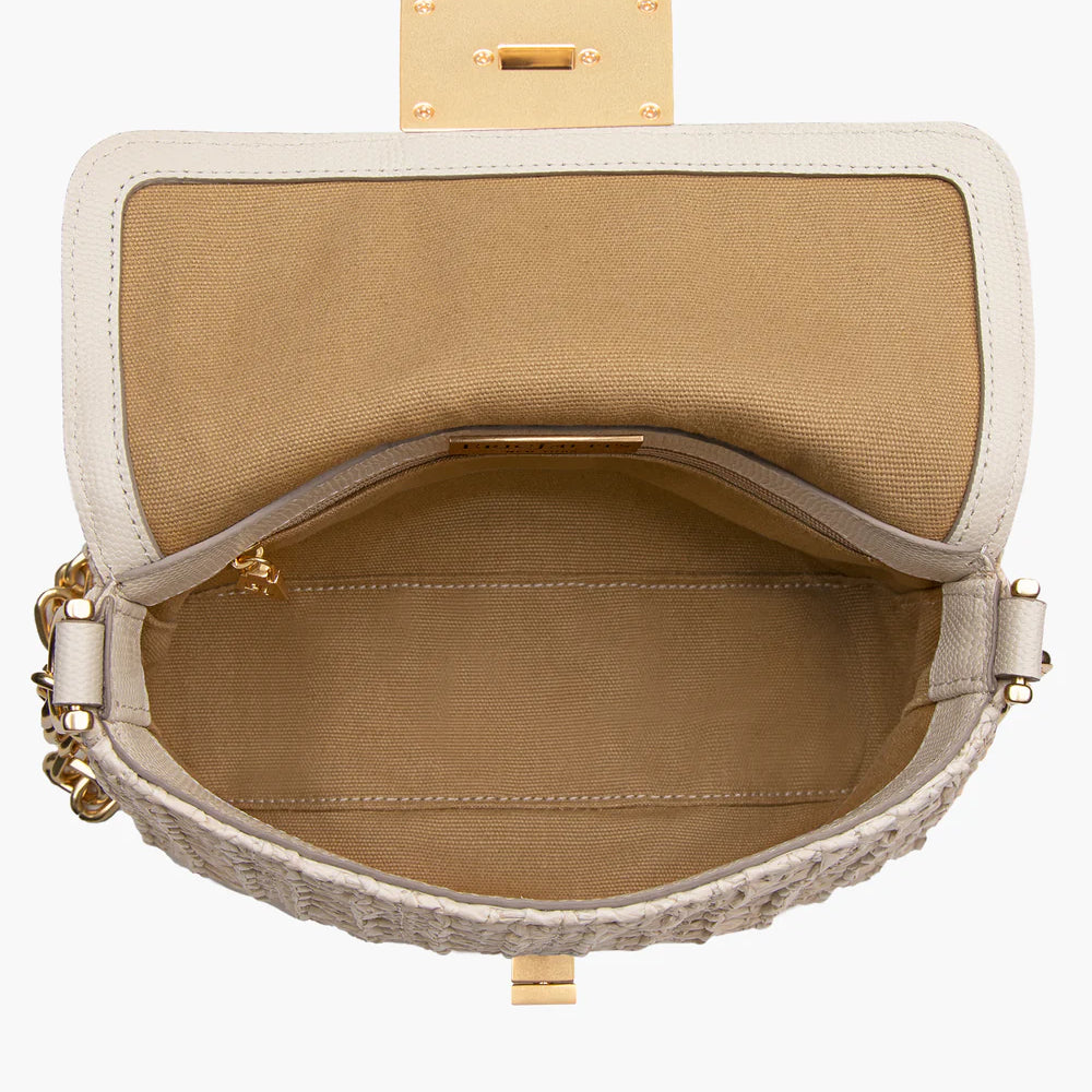 Parisian inspired pouch bag in woven raffia crochet features a bold turn lock closure, chain link shoulder strap that adjusts to longer length for crossbody use, and an outer rear pocket for easy access to phone.