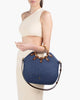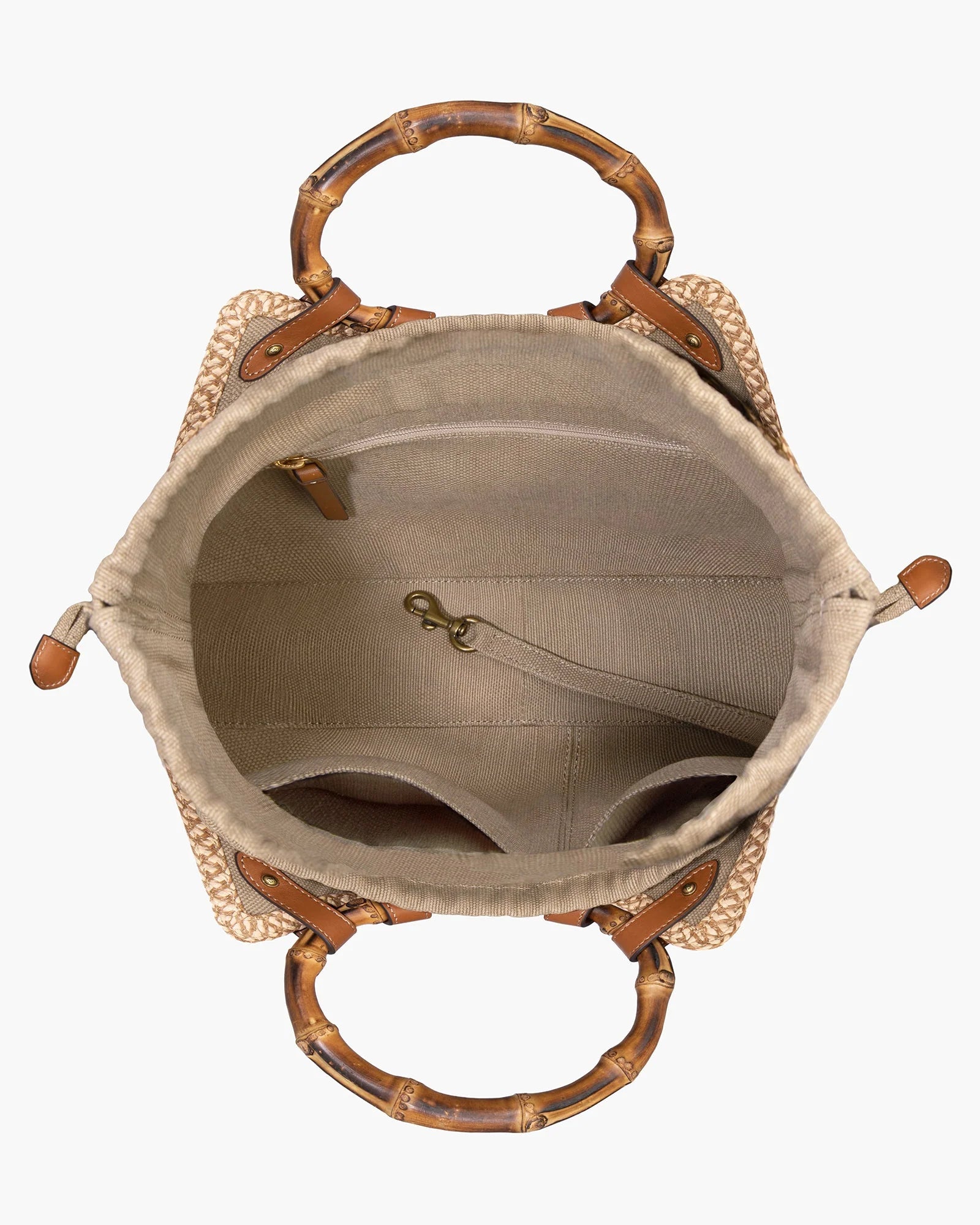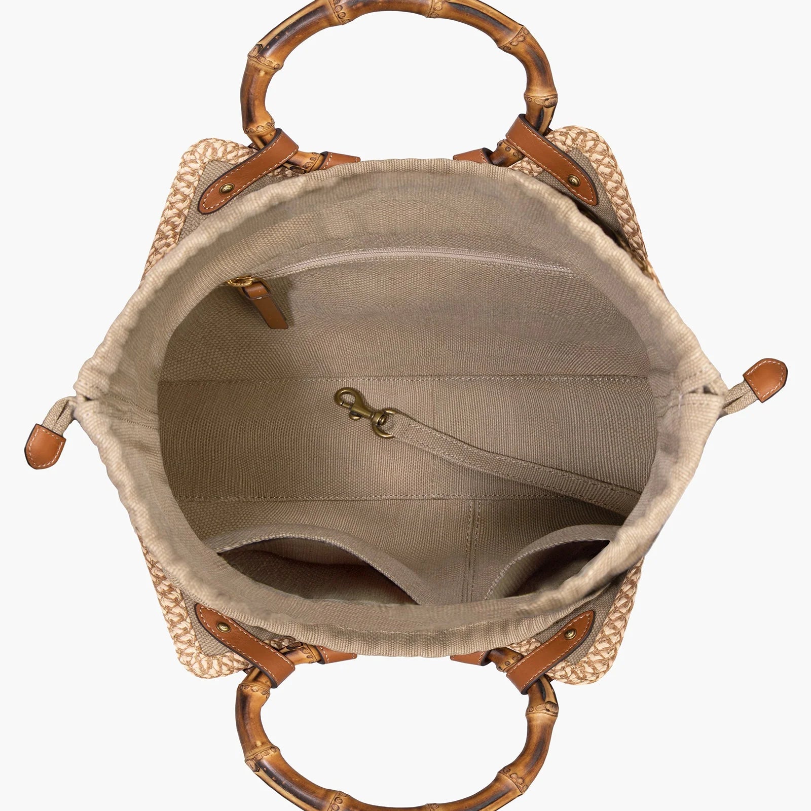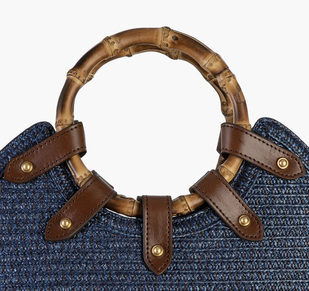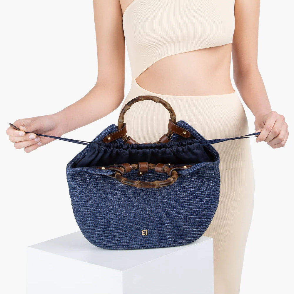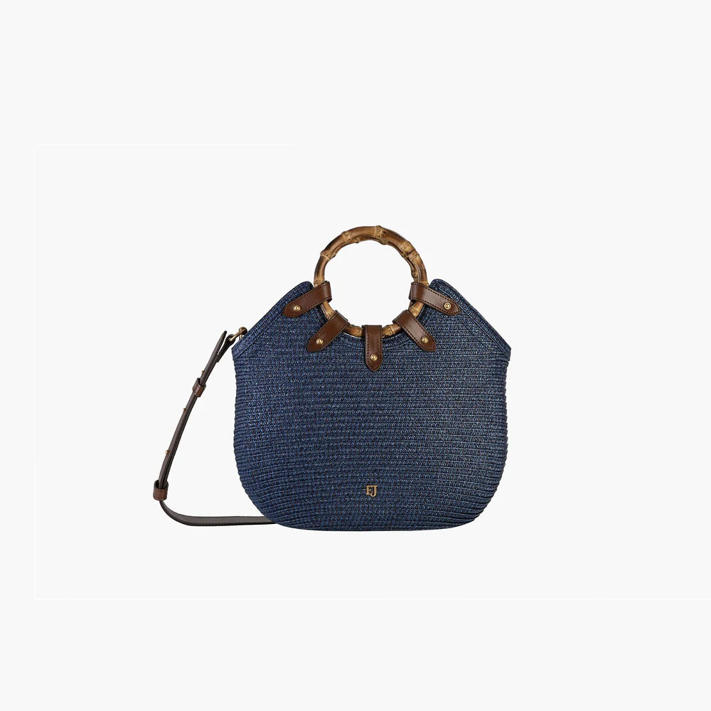 Chic mid-size resort-summer bag of stitched Squishee® straw braid balances elegance with function. Features include round bamboo top handles, secure draw-string closure, protective bottom feet, and detachable calf leather adjustable cross-body strap. Inside: canvas lining, sidewall zipper compartment, dual patch pockets, and key clip holder