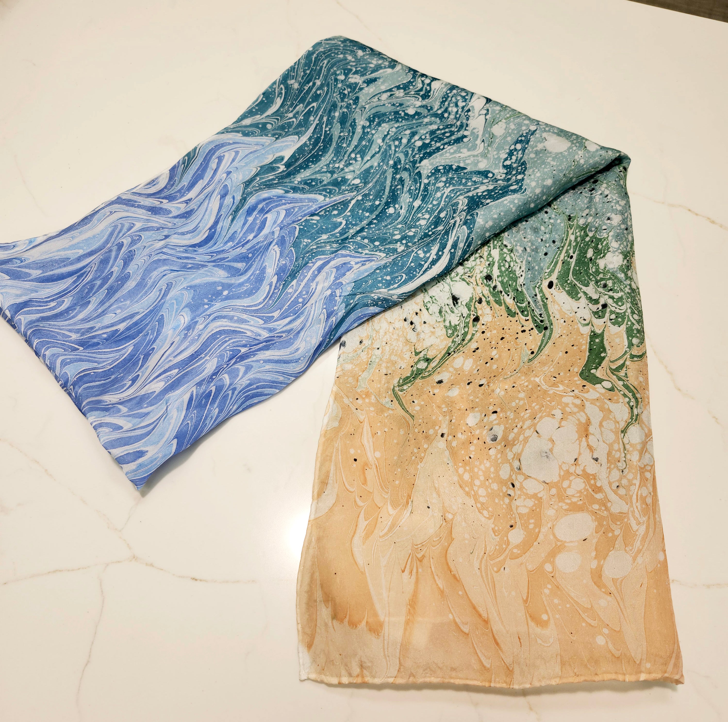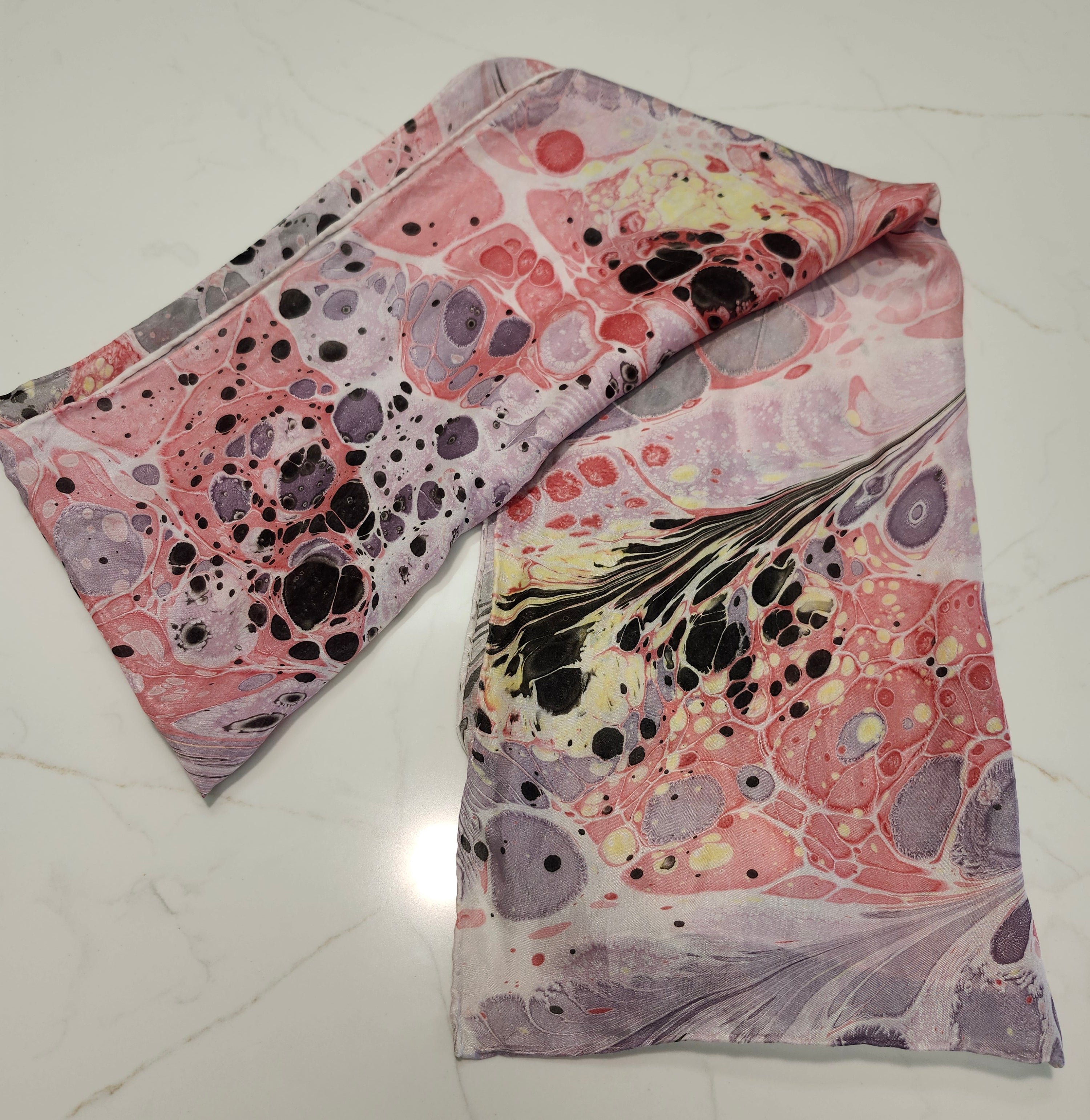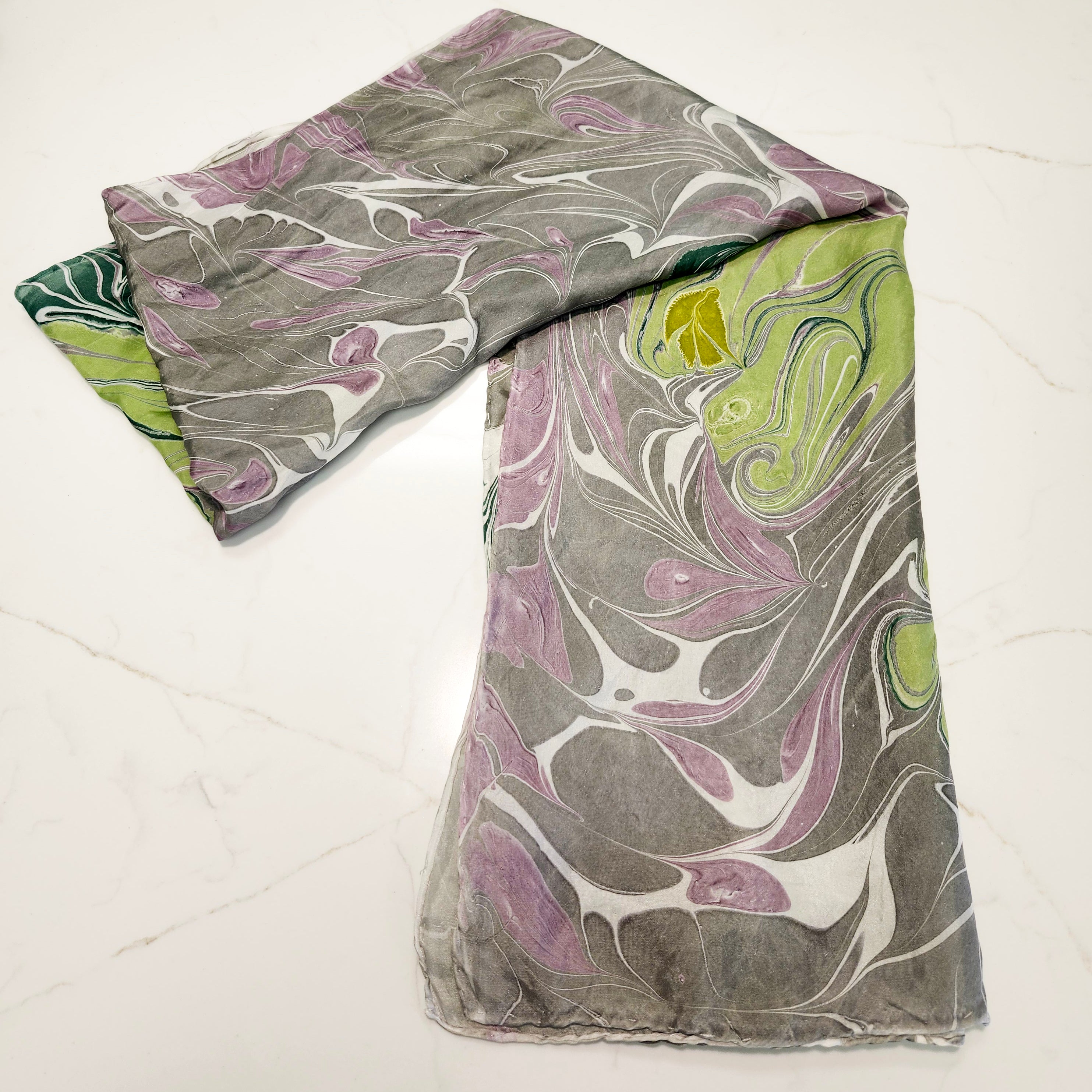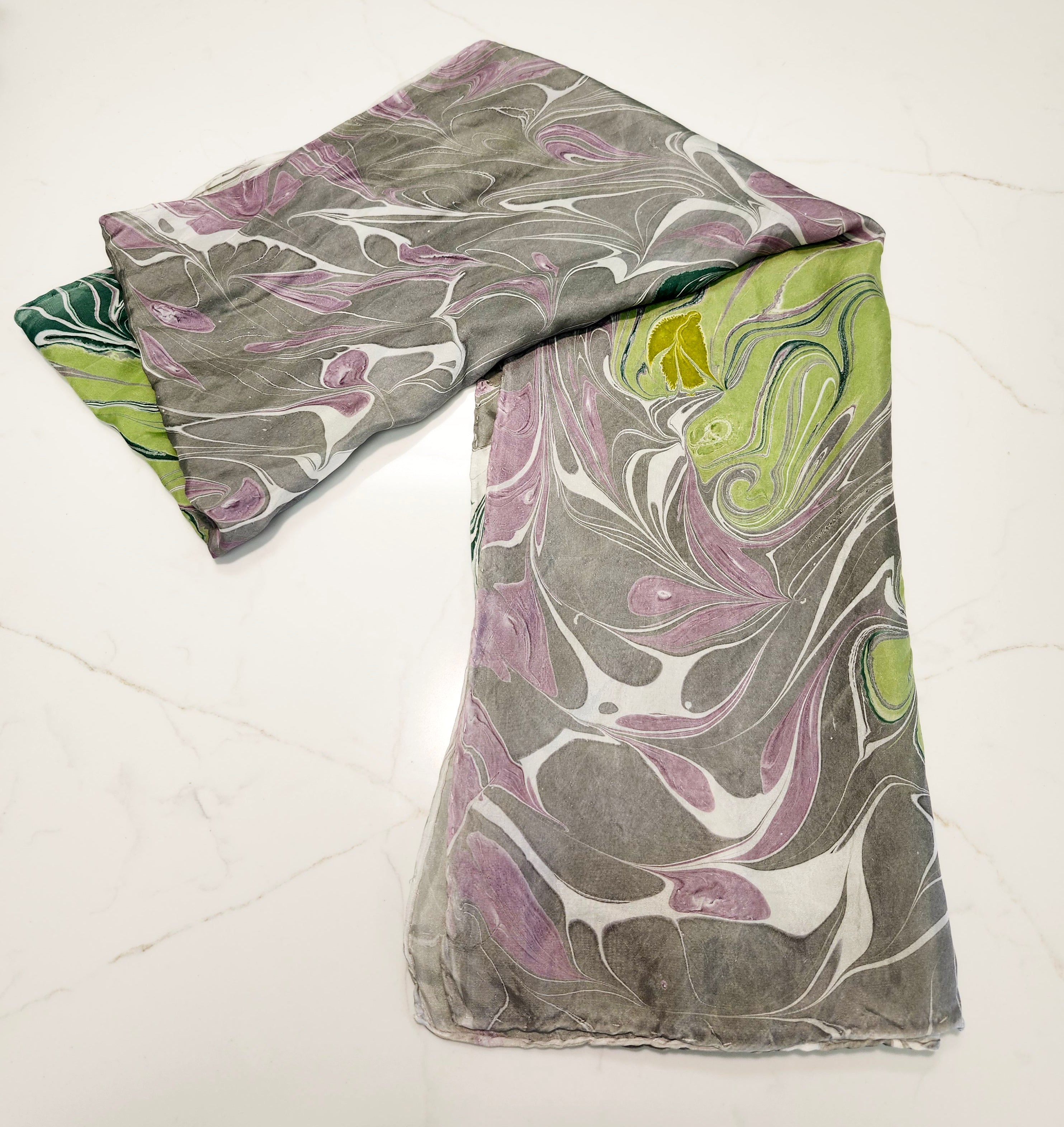 Pam Granger Gale's 100% Hand Marbled Silk Scarves are specially designed using custom mixed colors and patterns. Single Dipped. Hand wash warm water and hang to dry.